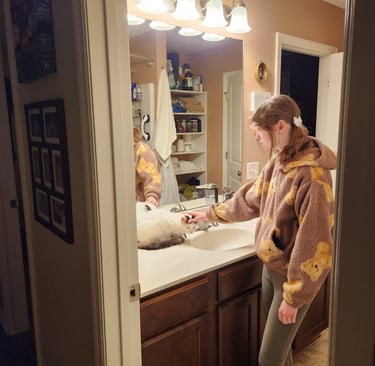 Every morning, Anais jumps onto the bathroom counter and settles in like she has a job to do. She watches my daughter get ready for school—focused, calm, unbothered by the mirror lights or the rush of the morning. They talk to each other. My daughter narrates her routine, and the cat responds in small, insistent sounds. Without hesitation, my daughter answers her back. The same way I once answered her. The same tone, the same patience. It’s familiar in a way that stops me short.